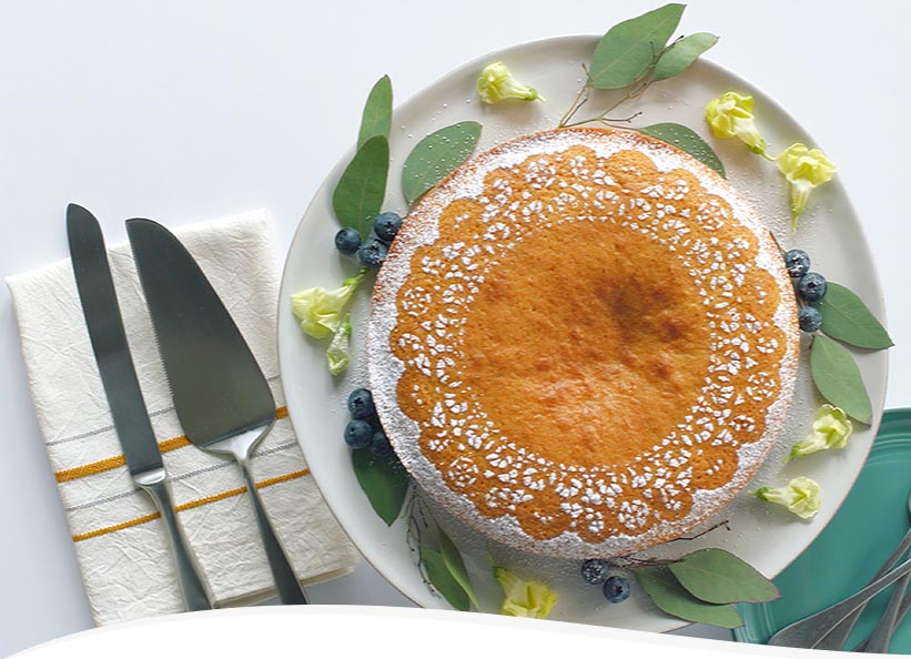 - Baker’s Note: For a more decorative design use a doily or stencil placed on top of the completely cooled cake. Sprinkle confectioner’s sugar over the doily or stencil. Carefully lift and remove the stencil to reveal the design in sugar.