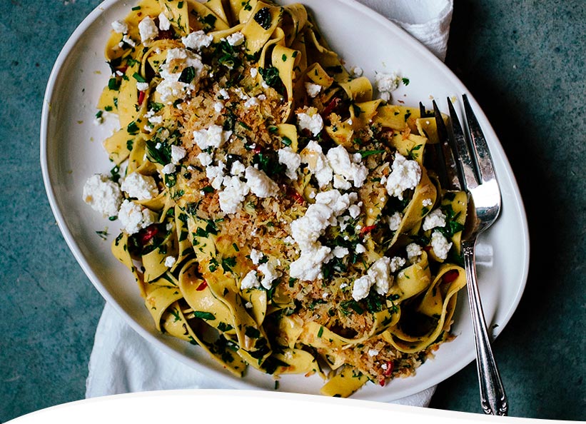 - Add the remaining tablespoon of Bellucci 100% Italian Extra Virgin Olive Oil to the skillet, then stir in the bread crumbs. Cook over medium heat until golden. Add a pinch of salt. Sprinkle the toasted bread crumbs over the pasta. Finish with the lemon zest, lemon juice, and crumbled goat cheese. Serve immediately.