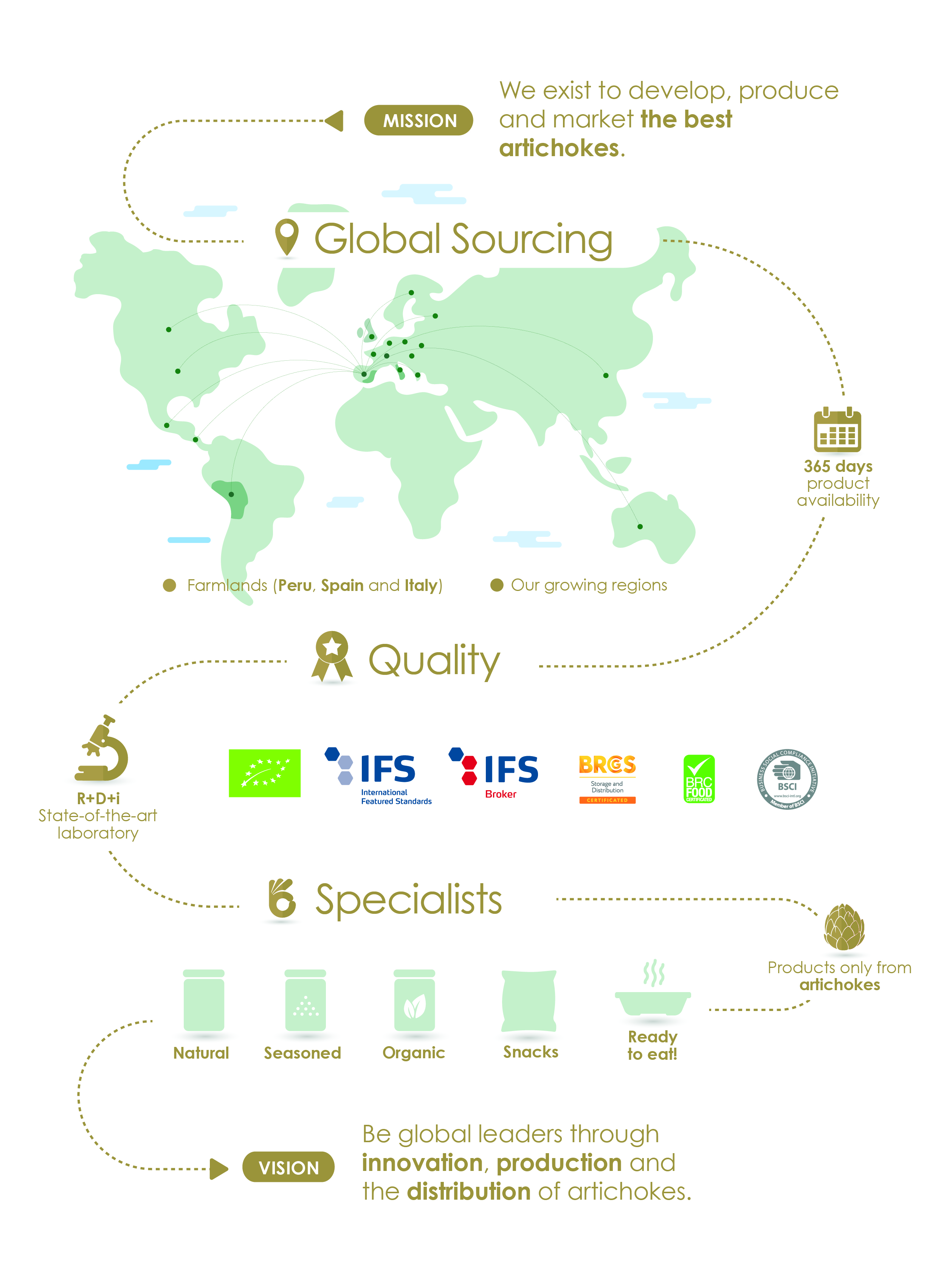 Their purpose is to offer artichokes and artichoke products so that the world can enjoy them through quality, variety and availability. They aim to be the top growers, producers and distributors of artichokes on the planet while consciously and ecologically supporting their land, farmers, employees and partners.