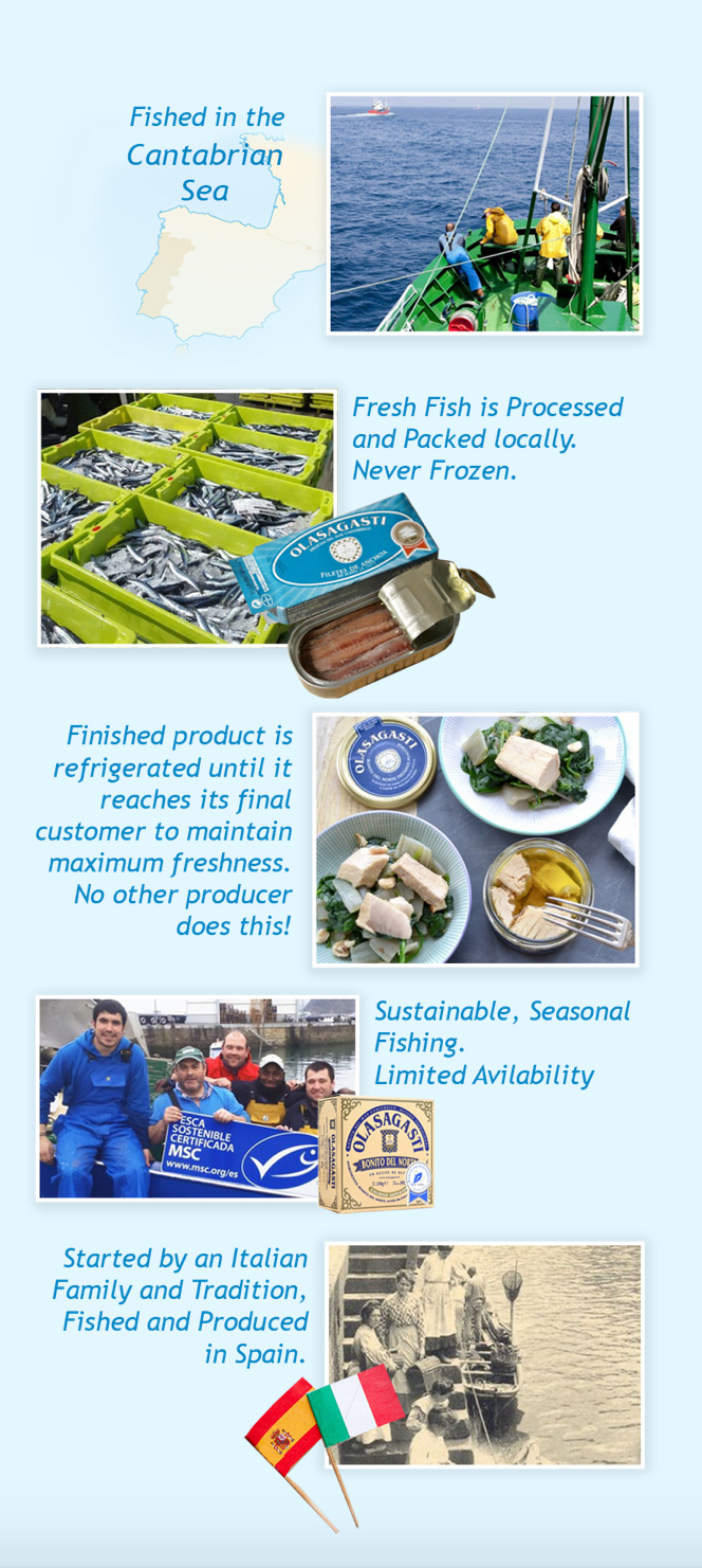 Olasagasti, located in the Basque region of Spain, has been in business since 1927 and produces its products using traditional Spanish methods. It has deep roots in both the Cantabrian and Mediterranean Seas. Its story starts at the end of the 19th century when Salvatore Orlando first sets foot on the shores of Getaria, in Gipuzkoa (Basque Country, Spain). He was sent from his native Sicily by his father. He was one of the Italian pioneers who introduced the long-standing salting techniques on the Cantabrian coast, where they were as yet unknown. Salvatore tied the knot with a Basque woman, Simona Olasagasti, and their marriage produced six children and various companies. The products of these companies were then distributed to Italy through established family business lines in that country.